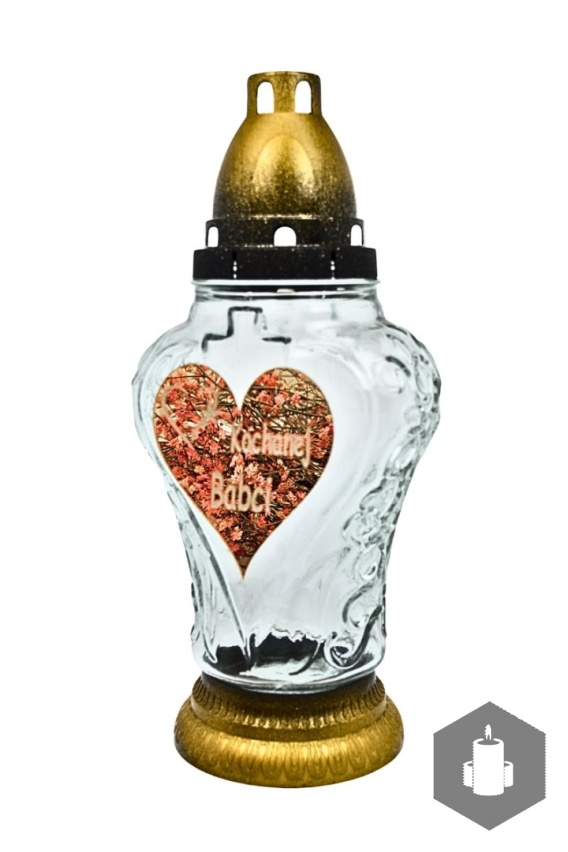 Lustrzany znicz szklany na "ZA-309 Babci" wykonany z bezbarwnego szkła z dekoracją w formie złotego lustra w kształcie serca z dedykacją "Kochanej Babci", które w wyjątkowy sposób odbija otoczenie, tworząc efekt głębi i elegancji, przy jednoczesnym zachowaniu pełnej widoczności światła emitowanego przez wkład. Delikatne przenikanie światła przez lustro uwydatnia dedykację, nadając całości subtelny i godny charakter, wymienny wkład startowy w komplecie.