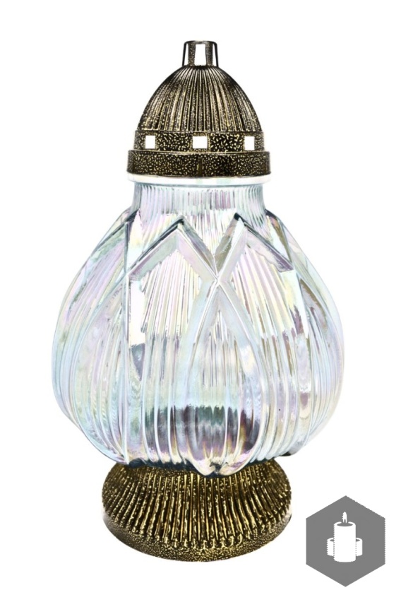 Elegancki znicz szklany na cmentarz "ZA-515" wykonany z dużego tęczowego szkła, wymienny wkład startowy w komplecie.