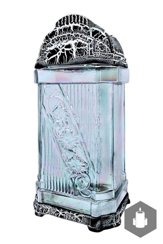 Elegancki znicz szklany na cmentarz "ZA-516" wykonany z dużego tęczowego szkła z kwiatami, dodatkowo estetyki dodaje mu niespotykane malowanie elementów plastikowych z elementem spękanej farby, wymienny wkład startowy w komplecie.