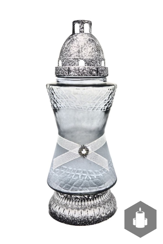 Elegancki znicz szklany na cmentarz "ZA-448" wykonany z grafitowego szkła częściowo oszronionego z delikatną wstążką oraz małym kwiatem, wymienny wkład startowy w komplecie.